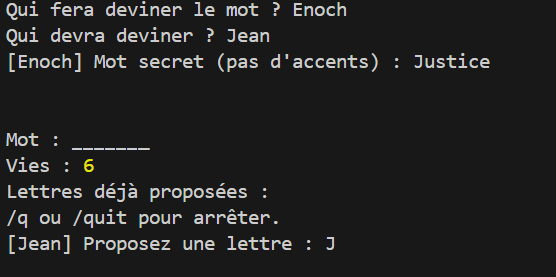 – Demande d’un nom pour un joueur 1 (qui donnera le mot) et pour un joueur 2 (qui devinera)