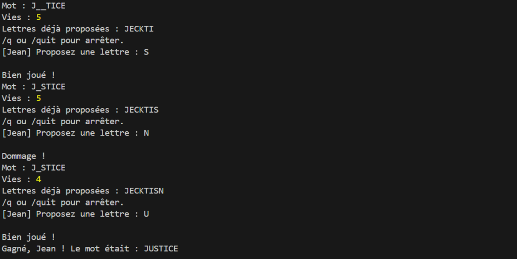 – Commande /quit (ou /q) pour interrompre la partie en cours (dès que le joueur 2 commence à deviner)